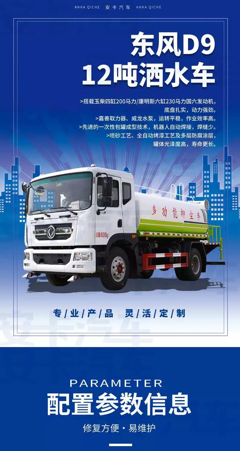 東風(fēng)D9環(huán)衛(wèi)12噸灑水車是一種根據(jù)不同的使用環(huán)境和目的有多種噴灑和運(yùn)水功能,集多種功能為一體的服務(wù)車。灑水車常用于城市道路、大型廠區(qū)、***、園林等單位清潔路面、衛(wèi)生、防塵、澆水、噴灑農(nóng)藥等。
