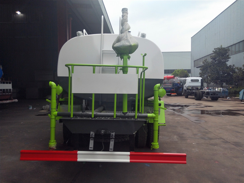 上裝配置:罐體容積為10.37立方灑水車,罐體鋼板為4mm碳鋼Q235材質(zhì),罐內(nèi)隔板具有防波作用,以減輕汽車行駛時罐體液體沖擊,罐體及整車外形尺寸按照公告。帶大功率專用灑水泵,泵可自吸自排,整車前沖、后灑、側(cè)噴、帶65消防接口,后平臺帶綠化灑水炮,灑水炮可全方位旋轉(zhuǎn),可連續(xù)調(diào)成直沖狀、大雨、小雨、毛毛雨;前封頭帶水位計,后平臺主管路帶1寸澆花接口,后爬梯。平臺后部帶小安全告知牌:“隨時停車,注意安全”,帶兩根水管及陰陽端。罐體顏色:上白/下藍,銀灰/銀藍,罐體兩側(cè)噴“灑水車、綠化噴灑車”字樣,貼反光標示。灑水車可加裝前沖后灑氣動閥駕駛室控制、可加裝霧炮機組發(fā)電機組噴霧降塵裝置、車頭可加裝推雪雪鏟、雪滾裝置街道、公路除雪等。