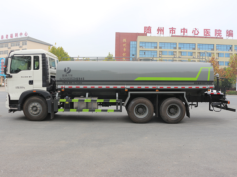 標(biāo)準(zhǔn)配置灑水車主要裝備有:前沖(沖洗公路路面)、后灑(公路路面養(yǎng)護(hù))、側(cè)噴、高位側(cè)花灑(路邊綠化帶優(yōu)化);后工作平臺(tái)高壓水炮,可調(diào)節(jié)成柱狀,射程≥28m;也可調(diào)節(jié)成霧狀,射程≥30米,水泵自吸高度:≤7m,灑水寬度:≥15m。側(cè)防護(hù)網(wǎng),自流閥,消防接頭。灑水車水泵為常壓水泵,功能可以抽水、排水。另外根據(jù)用戶要求,可加消防泵、噴霧機(jī)、農(nóng)藥卷盤、農(nóng)藥柱塞泵。罐內(nèi)可以做防腐防銹、電磁閥氣動(dòng)閥自動(dòng)放水等****,以滿足不同用戶需求。