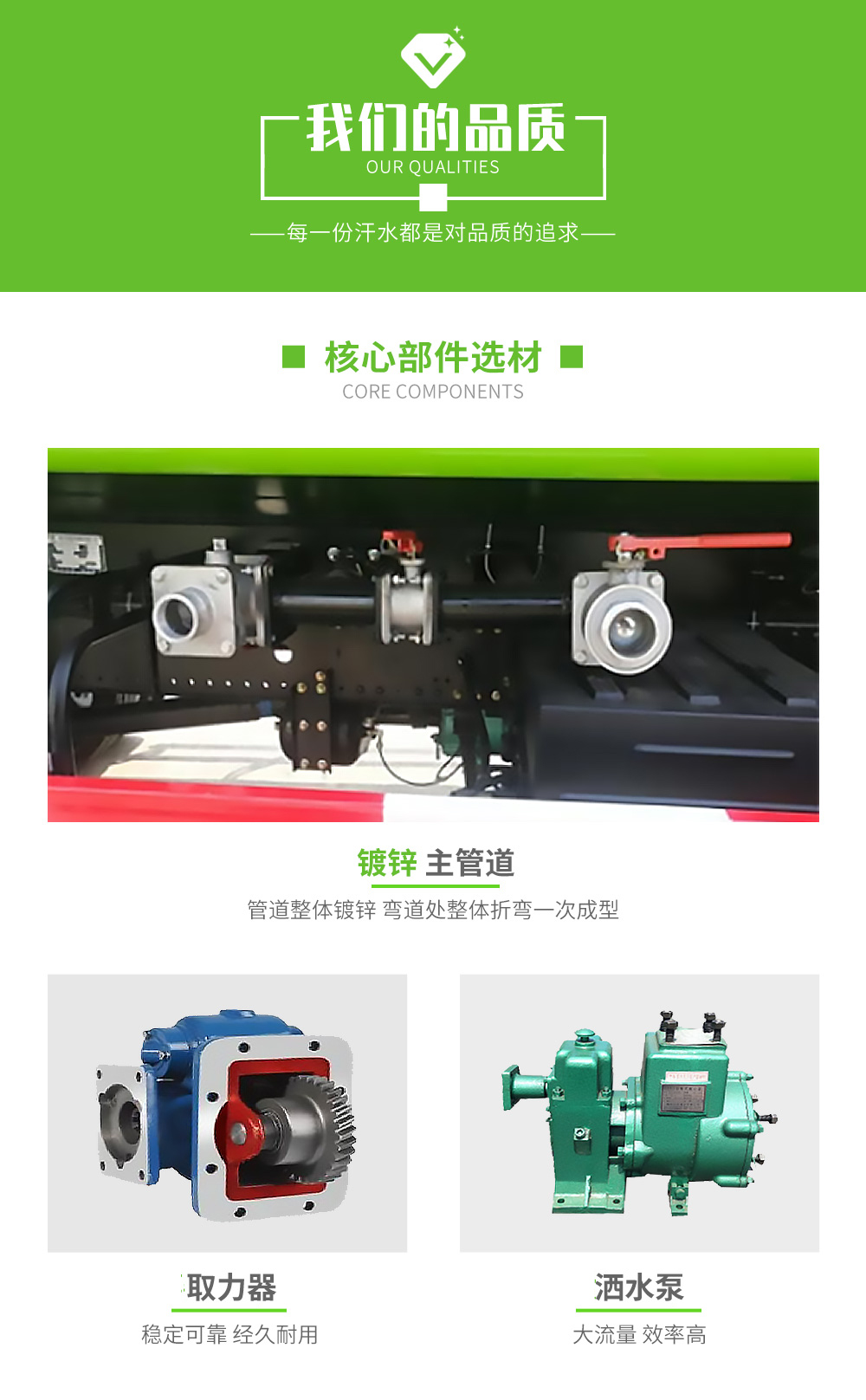 灑水車整車配備:1,廣西玉柴機(jī)器股份有限公司4缸玉柴165馬力發(fā)動(dòng)機(jī),發(fā)動(dòng)機(jī)型號(hào)YCY30165-60,法士特8檔變速箱,9.00R20鋼絲胎。