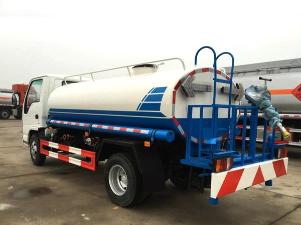 灑水車前裝有鴨形噴嘴或圓頭沖嘴,后面裝有圓柱開灑水噴嘴或蓮蓬頭噴嘴,后部有一工作平臺(tái),裝配有水炮。后部還可裝8個(gè)噴嘴(選裝)。