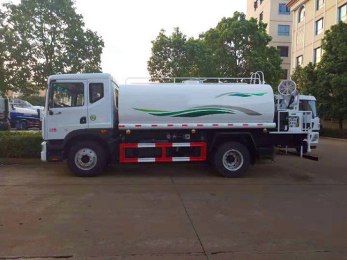 罐體采用4mm厚碳鋼板制作,罐體容積10噸,配備大功率專用灑水泵。前沖(噴)后灑,帶側(cè)噴,后置工作平臺(tái),平臺(tái)上安裝綠化灑水高壓炮(炮噴射形狀可調(diào)成直沖狀、大雨、中雨、毛毛雨、炮可360度旋轉(zhuǎn),射程≧25米)。帶自流閥,消防接口。帶自吸泵,可抽水或從消防栓上連接注水。