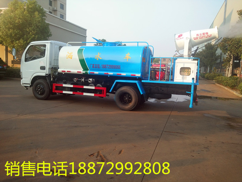 國六東風小多利卡帶霧炮5方灑水車采用 大功率水泵,灑水車前沖(噴)后灑,帶側(cè)噴,帶65消防接口,后平臺帶泡不帶門,前封頭帶水位計,后平臺主管路帶1寸澆花接口,后爬梯,配3米長抽水鋼絲塑料管兩根,用于抽水作業(yè)使用;罐后帶工作平臺,平臺上帶安全護欄,裝高位綠化灑水炮一個,灑水炮可全方位360度旋轉(zhuǎn),可連續(xù)調(diào)成直沖狀、大雨、小雨、毛毛雨等不同噴灑方式,調(diào)成直沖狀射程長度≥28m、高度≥12m,調(diào)成細雨狀射程寬度≥15m;后工作平臺下用槽鋼連接焊有5mm厚保險杠,提高灑水車的主動安全性,泵可自吸自排,安裝過濾網(wǎng),帶消防接口,可通過消防栓進水,帶自流閥,隨車選裝20米綠化卷盤,可噴灑農(nóng)藥