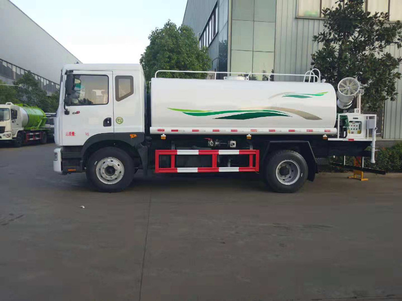 東風多利卡D9噴霧抑塵灑水車_抑塵車多少錢一輛;我公司生產的東風多利卡D9噴霧抑塵灑水車下線檢測了。車款車型選用東風多利卡D9系列單橋底盤,3950mm軸距,新款排半駕駛室,康明斯ISB180 50六缸發(fā)動機,國五排放,250mm車架,氣制動,動力轉向,離合助力,空調,電動窗,中控鎖,ABS,8噸后橋,4噸前橋,東風六檔變速箱,9.00R20鋼絲胎。選配30米噴霧抑塵機。罐體用5MM碳鋼板制作,罐內隔板具有防波作用,以減低汽車行駛時罐體液體的沖擊。整車帶一個專用灑水泵(垂直吸程6米),灑水寬度14米,射程28米。多功能灑水車配備2個前沖(噴)(能將路面泥巴、塵土、垃圾沖干凈);2個后灑(能均勻地將水灑在路面,一次灑水寬度14米)、2個側噴(花灑)(能均勻地將路旁綠化帶澆灌)、帶1個后工作平臺,平臺上安裝1個綠化灑水高炮(灑水炮可全方位旋轉,可連續(xù)調成直沖狀、大雨、小雨、毛毛雨,霧狀可調節(jié)沖洗高大樹木),引水時間<5min,流量90m3/h。帶1個消防接頭,帶1個自流閥,1個過濾裝置、人性化爬梯及側防護欄,安裝灑水音樂喇叭。