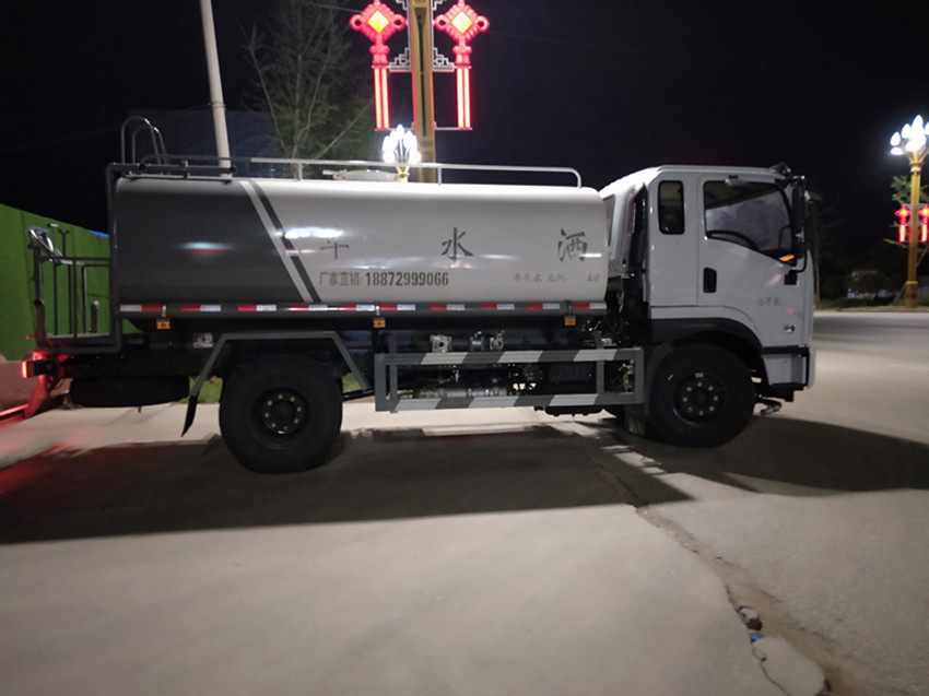 上裝配置:罐體采用優(yōu)質(zhì)碳鋼板制作,標(biāo)配,前沖(噴)后灑,帶側(cè)噴,罐體后帶工作平臺,平臺上安裝綠化灑水炮,灑水炮可***旋轉(zhuǎn),可連續(xù)調(diào)成直沖狀、大雨、小雨、毛毛雨,帶安全護(hù)欄,帶灑水泵,可自吸自排水(從池塘吸水,垂直吸深7米)。配兩個前沖灑水頭(灑水寬度14米),后面4個灑水噴頭(可向后面和側(cè)面灑水),后工作平臺及灑水高炮(高炮射程可達(dá)28米,可做應(yīng)及消防使用)。兩根吸水管(池塘吸水用),水位顯示計,音樂喇叭。