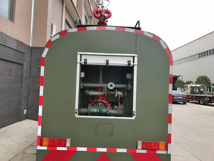 越野灑水車水罐體上裝配置:罐體采用碳鋼Q235板材,板材厚度4mm,罐體容積10-12立方,安裝全功率夾心取力器,CB10/40型消防水泵,帶PS40消防水炮一個(gè),射程大于55米,后置工作泵箱,消防栓接口左右各一個(gè),駕駛室頂部安裝長(zhǎng)條警燈帶喊話器,全車顏色軍綠,兩側(cè)噴涂白色森林消防字樣。