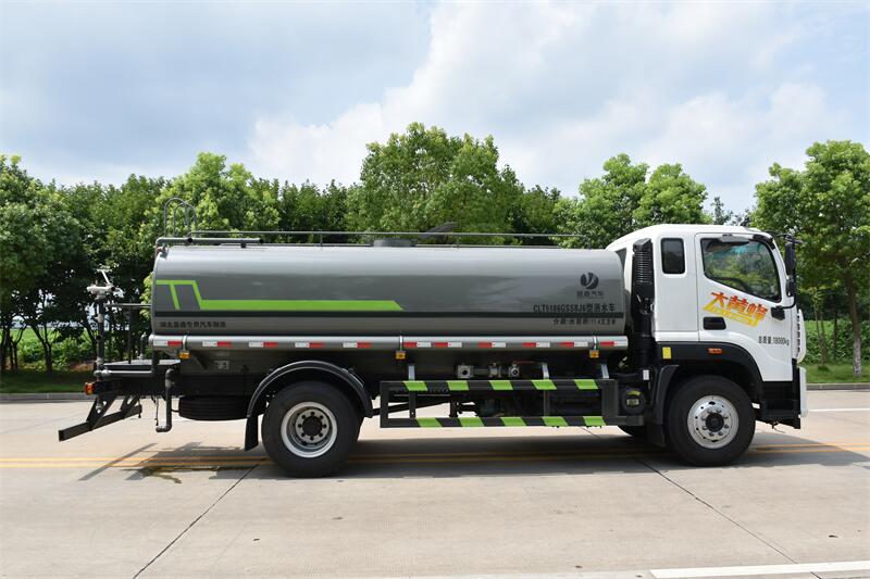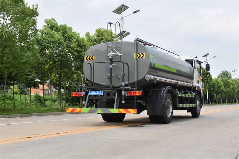 福田15噸灑水車標配前噴(鴨嘴)、后沖、后灑、側噴、后置式工作 平臺,平臺上配置綠化水炮(可 360°旋轉(zhuǎn),既可以調(diào)成柱狀,也可 以調(diào)成霧狀,更可以調(diào)成直沖狀、大雨、中雨、小雨、毛毛雨),配 備優(yōu)質(zhì)大功率專用灑水泵(可自吸自排,可從河里或池塘抽水到罐體), 取力器,雜物過濾網(wǎng),消防接口,自流球閥系統(tǒng)、取力器、球閥、濾網(wǎng) 均為國家標準產(chǎn)品,主管道加粗,法蘭墊、法蘭盤加厚,大通徑球閥。 整體具備性能優(yōu)良安全可靠、效率高、流量大、維修方便等特點。 二.產(chǎn)品配置 1.底盤配置: 發(fā)動機玉柴 200 馬力(四缸),法士特 8 檔變速箱,軸距 4500,前 橋 4.5T,后橋 10T,10.00 鋼絲胎,斷氣剎,空調(diào),電動玻璃,ABS。