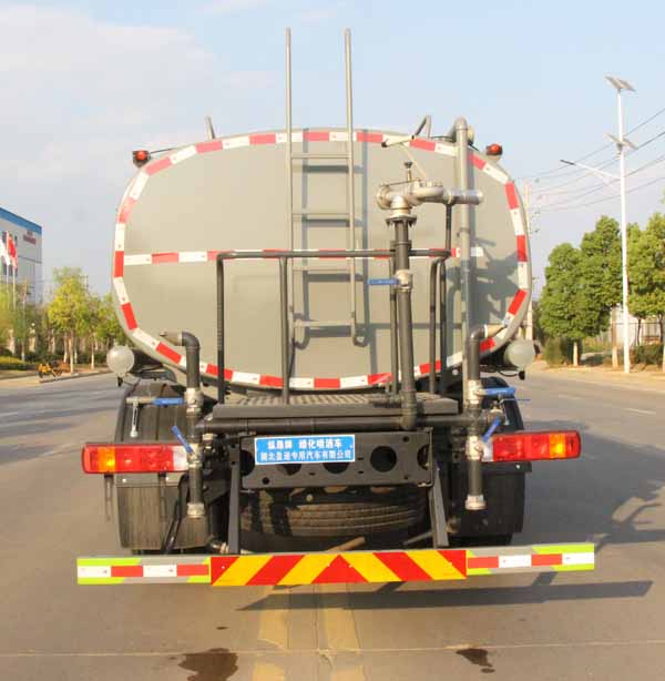該車主要用于城鄉(xiāng)園林綠化噴灑作業(yè).主要裝置為罐體及噴灑裝置.罐體總?cè)萘?10.06立方米,罐體有效容積:9.58立方米,罐體外形尺寸(長×長軸×短軸)(mm):4200×2300×1450,4000×2300×1540.ABS系統(tǒng)型號:ABS-E;生產(chǎn)企業(yè):威伯科汽車控制系統(tǒng)(中國)有限公司.ABS系統(tǒng)型號:ABS-VI.E;生產(chǎn)企業(yè):廣州瑞立科密汽車電子股份有限公司;ABS系統(tǒng)型號:3550D-1010;生產(chǎn)企業(yè):東科克諾爾商用車制動系統(tǒng)(十堰)有限公司.側(cè)、后防護材料均為:Q235碳鋼,連接方式均為:螺栓連接,后部防護截面尺寸(mm):120×50,后部防護離地高度(mm):470.僅采用底盤3950mm軸距改裝.選裝前部電子霧炮裝置樣式;選裝前部不帶電子霧炮裝置,當前部選裝不帶電子霧炮時,車長7450mm,7785mm,無前伸.當前部選裝帶電子霧炮時,車長7950mm,8285mm,前伸為500mm.隨底盤選裝限速裝置,最高車速(km/h)為90.后軸僅采用鋼板彈簧懸架.選裝噴灑裝置樣式,選裝罐體頂部無高位花灑裝置,選裝尾部箭頭燈裝置,選裝自動球閥安裝位置.后部作業(yè)燈僅在作業(yè)時開啟,車輛行駛過程中不可開啟.