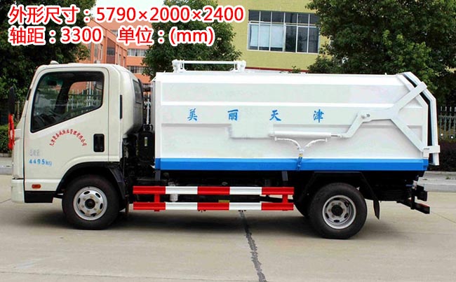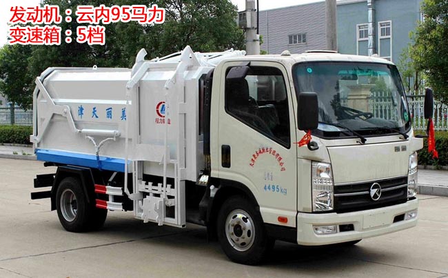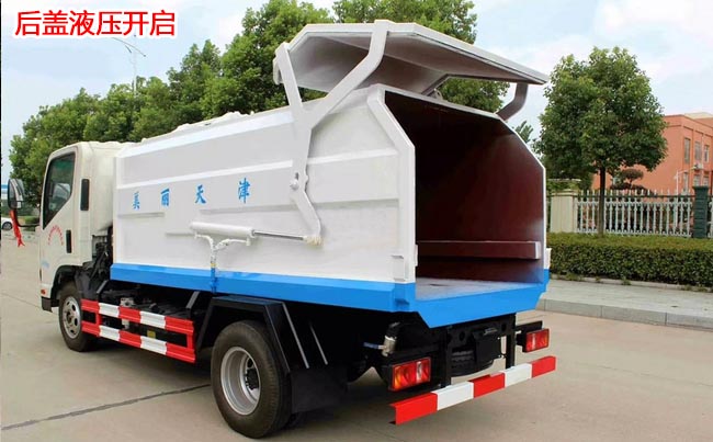 箱體容積5~6立方米,外形與掛桶垃圾車(chē)相似,箱體材料邊三底四碳鋼,內(nèi)部做防銹處理,側(cè)方帶掛桶提升機(jī)構(gòu),車(chē)尾部橡膠密封條,內(nèi)置推板,后蓋液壓開(kāi)啟。