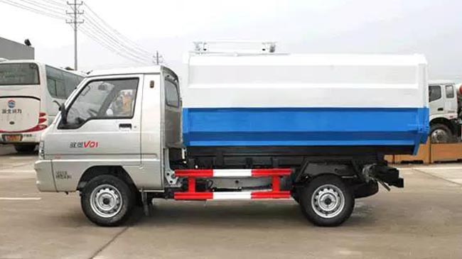 箱體容積2~3立方米,全密封式垃圾箱體,采用碳鋼邊三底四焊接制作,邊板折彎強(qiáng)化,箱體右側(cè)配液壓掛桶提升機(jī),國產(chǎn)油泵、多路閥、取力器、油缸,卸料方式為底部雙杠液壓舉升自卸,駕駛室外操作,鐵桶掛架,后門機(jī)械鎖緊,手動開門,可選液壓開門。