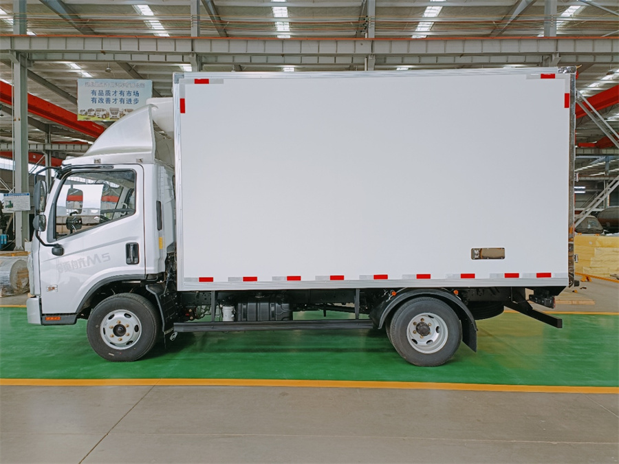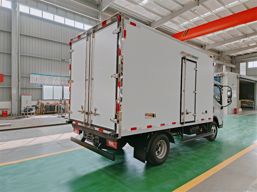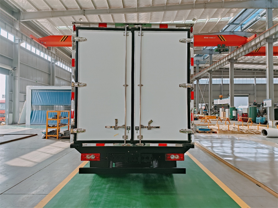 廂體底部為塑鋼花紋板,廂內側面帶圍裙,前部排水孔,門邊條采用防雨設計和迷宮式橡膠密封條,鋁合金型材包邊,不銹鋼包角,不銹鋼門鎖,加厚型不銹鋼后門合頁及鎖件,廂體內采用LED照明燈。
