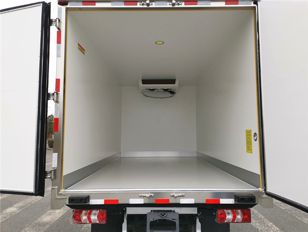 國(guó)六江淮駿鈴V5藍(lán)牌冷藏車廂體配置為:采用斷橋隔熱工藝,整體框架結(jié)構(gòu)制作,廂體內(nèi)、外壁材料為玻璃鋼板,采用高密度保溫層,廂板內(nèi)帶有骨架,廂體厚度80mm,門框,門飾件、包角全部使用不銹鋼材質(zhì)。最新款鋁合金包邊型材,廂體內(nèi)采用LED照明燈及廂體示寬燈;門框密封條為橡膠材質(zhì),后門梁帶加厚防撞塊,加厚型不銹鋼鉸鏈及鎖件。車體副梁采用510L高強(qiáng)度鋼制作,底板為鋁花紋板,車廂后門帶一個(gè)上車扶手,其余標(biāo)配;