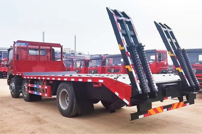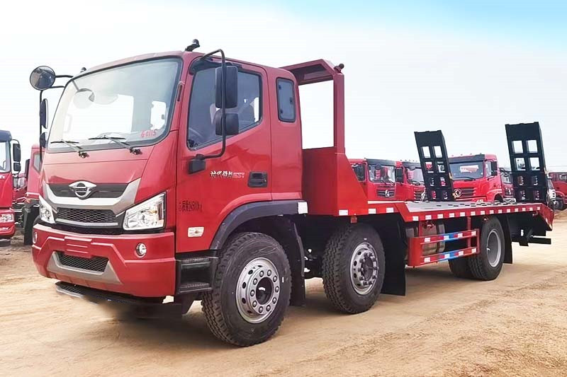 福田前四后四平板拖車,國六排放標準,采用新款瑞沃ES5駕駛室,標配中控鎖電動門窗、原廠空調(diào)、氣囊座椅、定速巡航、ABS等,可定制液壓雙節(jié)折疊爬梯,爬梯長度4米以上,運輸叉車等機械設備