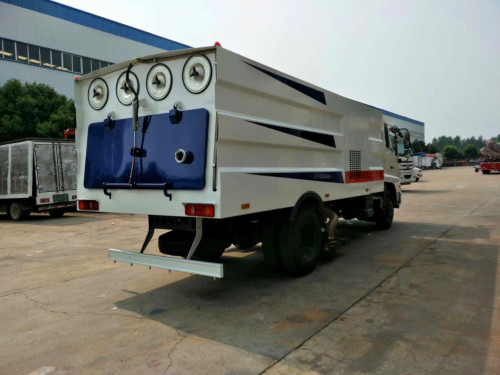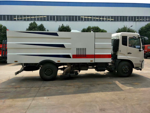 該掃路車采用東風(fēng)天錦型國五二類底盤改裝,加裝副發(fā)動機(jī)、風(fēng)機(jī)、清水箱、垃圾箱、左右立掃、后置吸盤,掃盤降塵系統(tǒng),液壓系統(tǒng)、專用裝置電控系統(tǒng)和副車架等改裝而成(可加裝前沖后灑,可以根據(jù)客戶要求做成方形、圓形箱