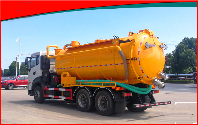 上裝為一體式罐體結(jié)構(gòu),分污水罐和清水罐兩部分,采用優(yōu)質(zhì)碳鋼制作而成,罐體厚度為8毫米,罐體內(nèi)部均安裝有爬梯,底部焊有1.6米左右的不銹鋼底板,罐體外部也安裝有爬梯。清水罐頂部安裝有排氣閥,底部安裝有排水閥。清洗部分選用350大流量高壓泵,雙向進(jìn)水,帶氣吹水功能,高壓泵安裝有過濾網(wǎng),標(biāo)配100米高壓管,后封頭8毫米厚,尾部液壓絞盤可旋轉(zhuǎn)180度,加裝有節(jié)流閥,用于控制快慢。整車上裝搭配有420馬力副發(fā)動(dòng)機(jī),標(biāo)配大型水循環(huán)泵,搭配不銹鋼水循環(huán)泵水箱,吸污管標(biāo)配長(zhǎng)度為10米。后封頭標(biāo)配有6寸球閥1個(gè),4寸球閥3個(gè),直徑600mm的液壓開啟蓋,方便排放污水,罐體帶液壓舉升功能,排污快捷方便。