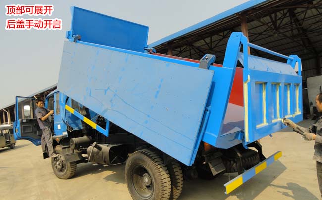 載重量10噸,外形尺寸長(zhǎng)4.2米,寬2.3米,高0.8米,采用4毫米厚鋼板制作,箱頂可展開(kāi),可向兩邊展開(kāi)折疊,箱底雙缸液壓自卸,手動(dòng)開(kāi)啟尾門。